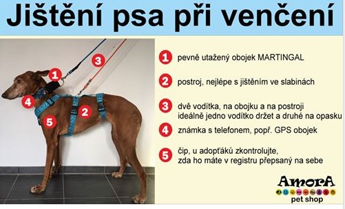 Doporučujeme tzv. „dvojí jištění psa“ tedy obojek a postroj. Přikládáme názorný obrázek, který připravila majitelka dvou adoptovaných fenek z útulku Sara, P. Zelingerová. V začátku by takto měl být jištěný každý náš adopťáček.